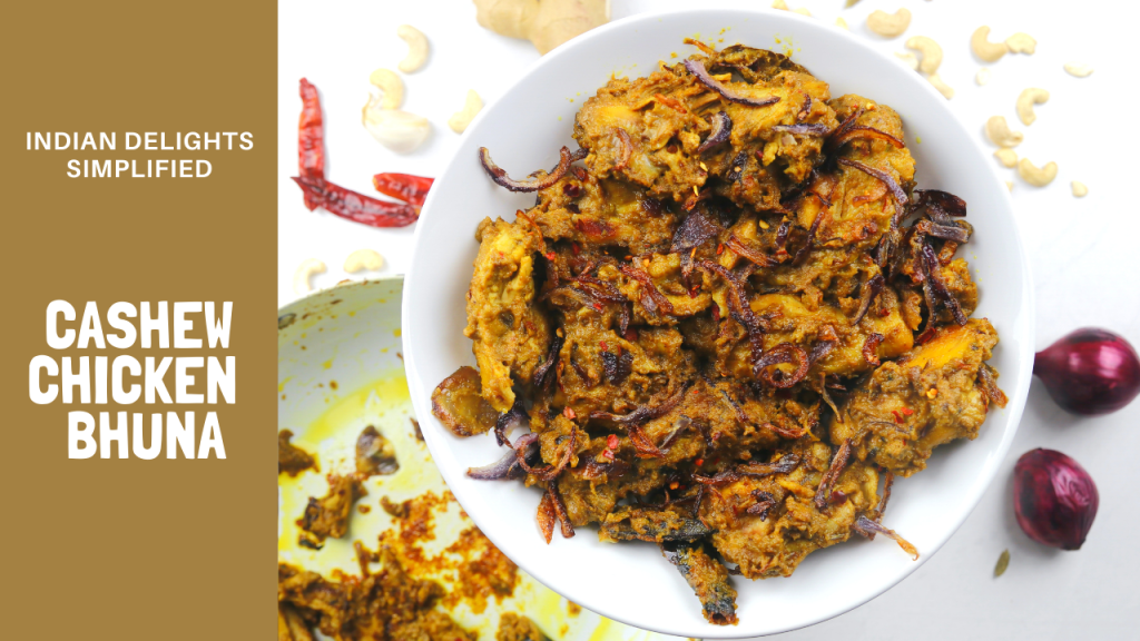 Mild and yet deliciously rich, Cashew Chicken Bhuna is my take on chicken Bhuna with the added indulgence of creamy cashew nut sauce. It pairs beautifully with rice, naan, Tandoori Rotis and chapatis and an oniony lemony fresh salad of cucumbers, tomatoes and chillis. Choose any low or no fat variety of Indian bread or rice with my Cashew Chicken Bhuna; that way you will truly experience the decadent creaminess of this dish that is very hard to beat.