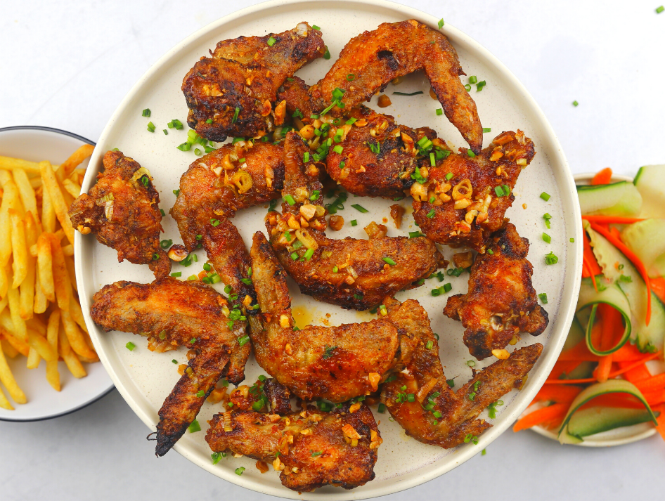 - Mix all of the ingredients listed under dry rub and pour over the chicken wings.