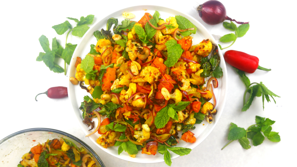 This roasted cauliflower and sweet potato salad is and will probably always be one of my favourite veggie sides. Vegan, fresh, flavourful and filling, my roasted cauliflower and sweet potato salad is quite versatile and can be served with any protein, in wraps, over steamed or pilaf rice or just own its own. In fact, I find it quite refreshing as an afternoon snack; its packed full of healthy ingredients while delivering wonderfully in terms on taste, flavour and crunch that makes it quite a treat.